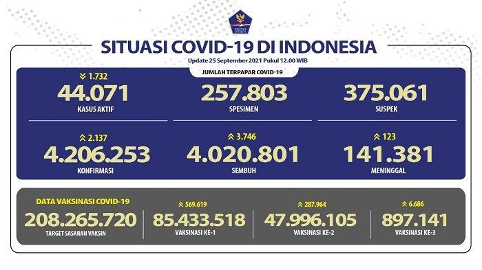 UPDATE Covid-19 Indonesia 25 September 2021: 2.137 Orang Positif, 3.746 Pasien Sembuh, 123 Wafat