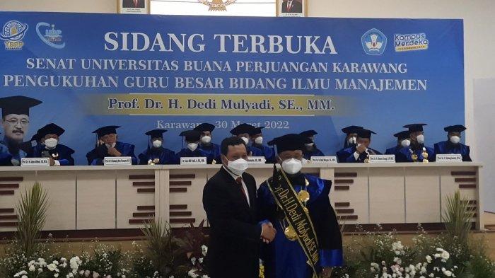 Rektor Universitas Buana Perjuangan (UBP), Dr. H. Dedi Mulyadi, SE., MM dikukuhkan menjadi guru besar bidang ilmu manajemen, pada Sidang Terbuka di Aula UPB Karawang, Rabu (30/3/2022).