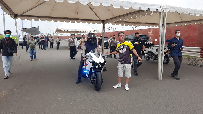 Lalu, dia memacu cepat moge Kawasaki Ninja H2 1000 CC itu tepat di lintasan sepanjang 800 meter dengan trek balap yang digunakan sepanjang sekira 500 meter.