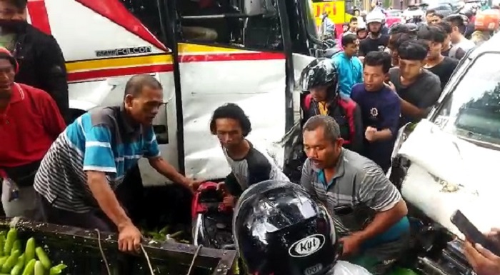 Kecelakaan beruntun tersebut melibatkan bus, mobil pikap pengangkut sayur, angkutan umum dan tiga unit sepeda motor.
