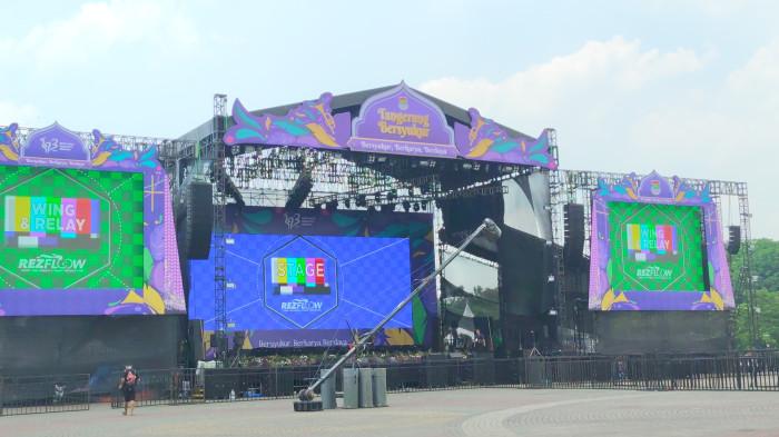 Berdasarkan pantauan di lokasi, satu panggung besar untuk Tangerang Bersyukur tampak sudah berdiri kokoh, lengkap dengan ornamen berwarna ungu khas Kabupaten Tangerang.
