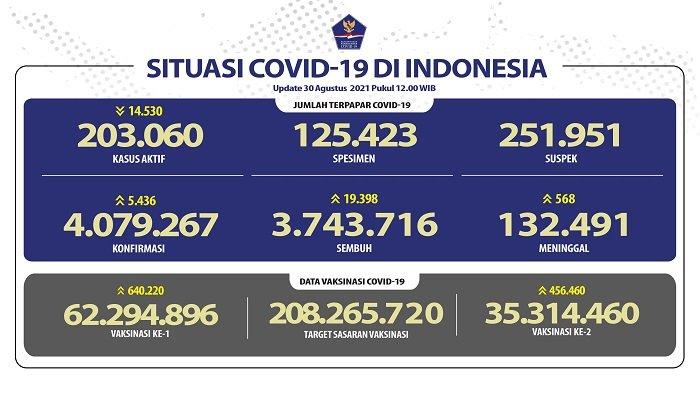 UPDATE Covid-19 Indonesia 30 Agustus 2021: 5.436 Pasien Baru, 19.398 Orang Sembuh, 568 Meninggal